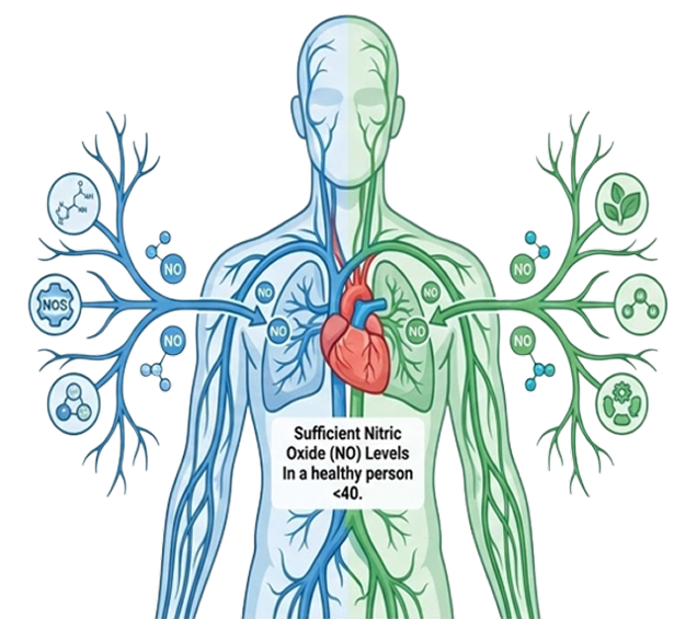 This is the body’s primary engine for producing Nitric Oxide. It relies on a complex enzymatic process to convert L-arginine into active NO. While it operates at 100% capacity during our youth, producing roughly 1,000 µmol per day. This pathway experiences a severe, natural decline as we age due to oxidative stress and enzymatic breakdown.