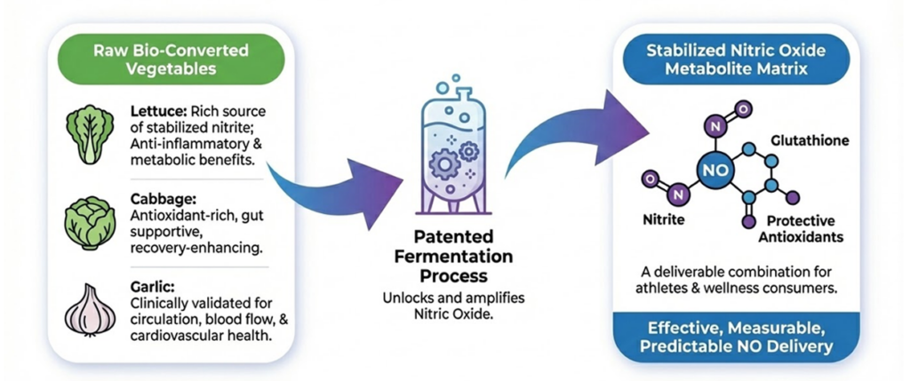 The process begins with nature. We source a specific, highly potent complex of nitrate-rich vegetables, including garlic, lettuce, and cabbage. Rather than relying on a single, synthetic compound, we harness the full biological potential of these natural precursors to serve as the foundation for our bio-engineering process.